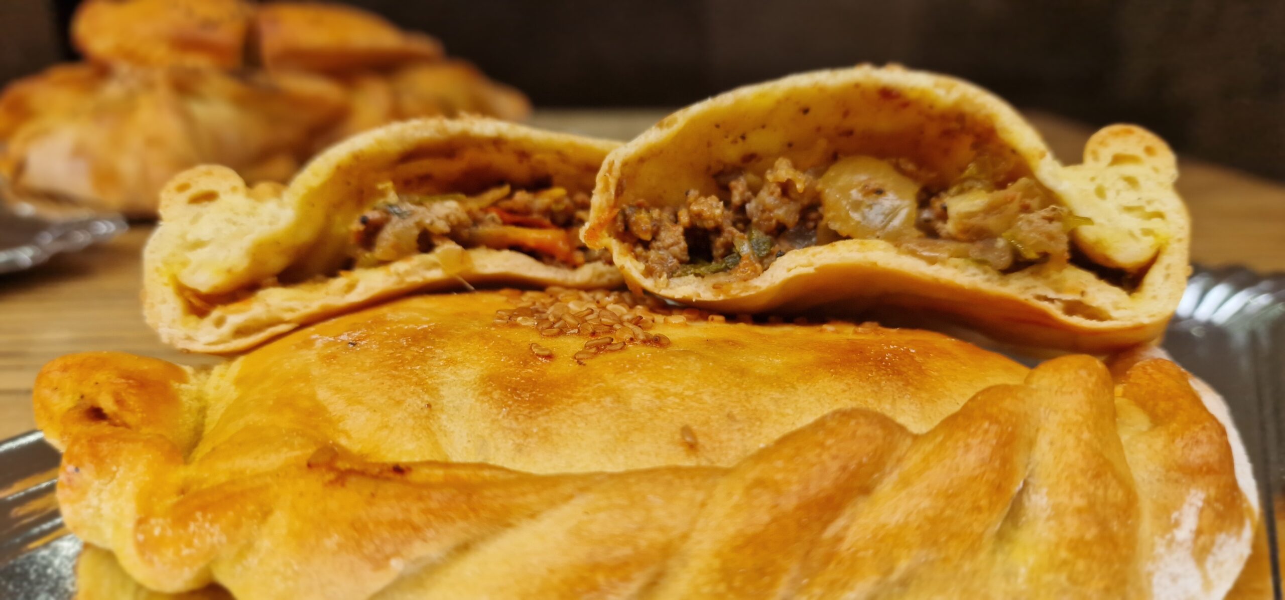 Deliciosa empanada elaborada con masa dorada y crujiente, rellena de carne seleccionada y un sabroso sofrito de verduras. Una combinación equilibrada de sabor y textura, ideal como plato principal, para compartir o disfrutar en cualquier momento del día.