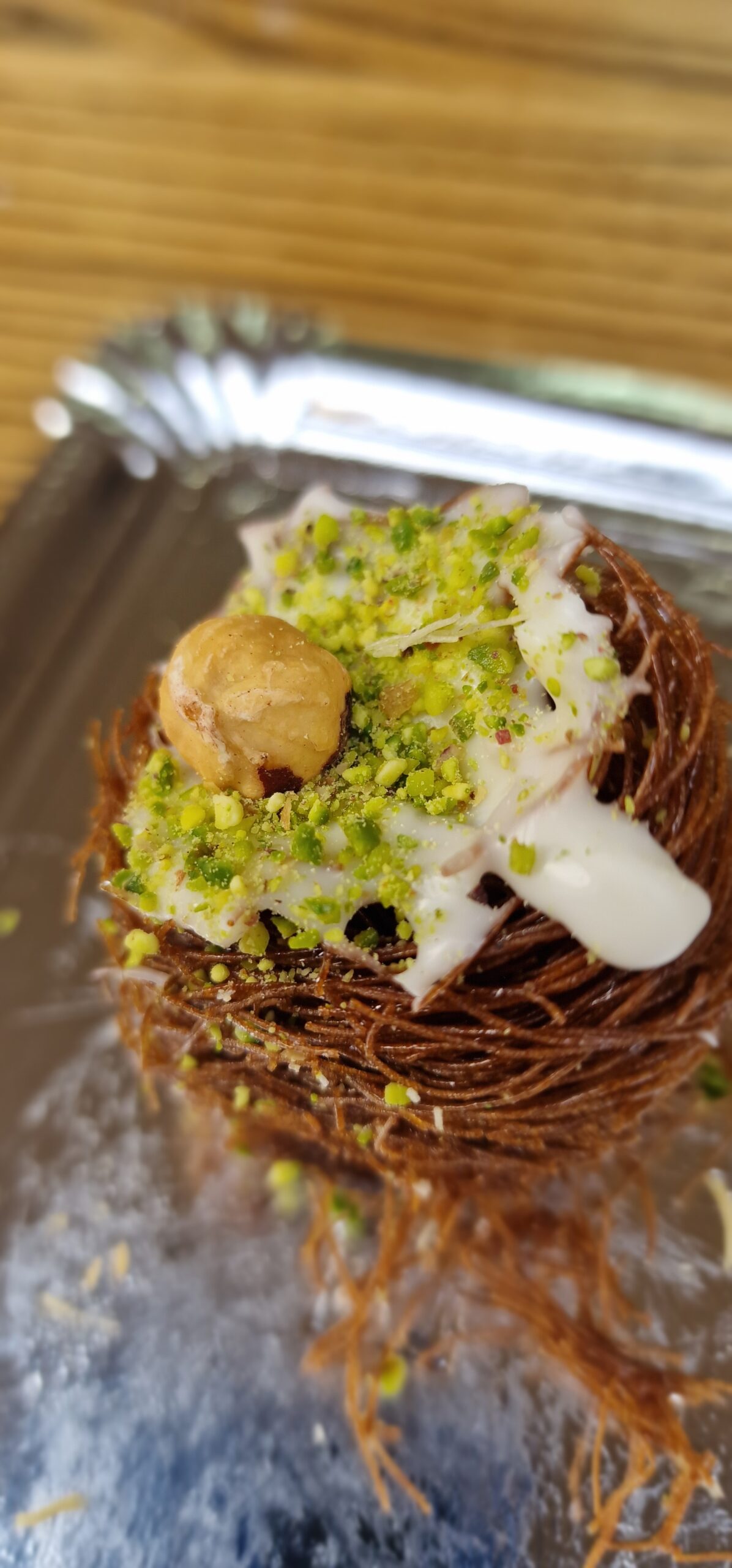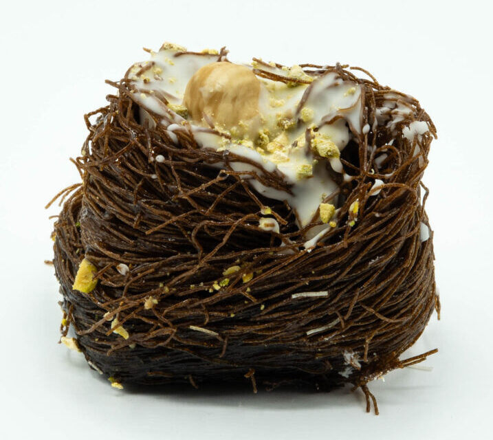 Delicioso dulce elaborado en forma de nido crujiente, relleno de cremoso chocolate y trozos de avellanas seleccionadas. Una combinación perfecta de textura y sabor que conquista desde el primer bocado, ideal como postre, snack o acompañamiento de café y té.