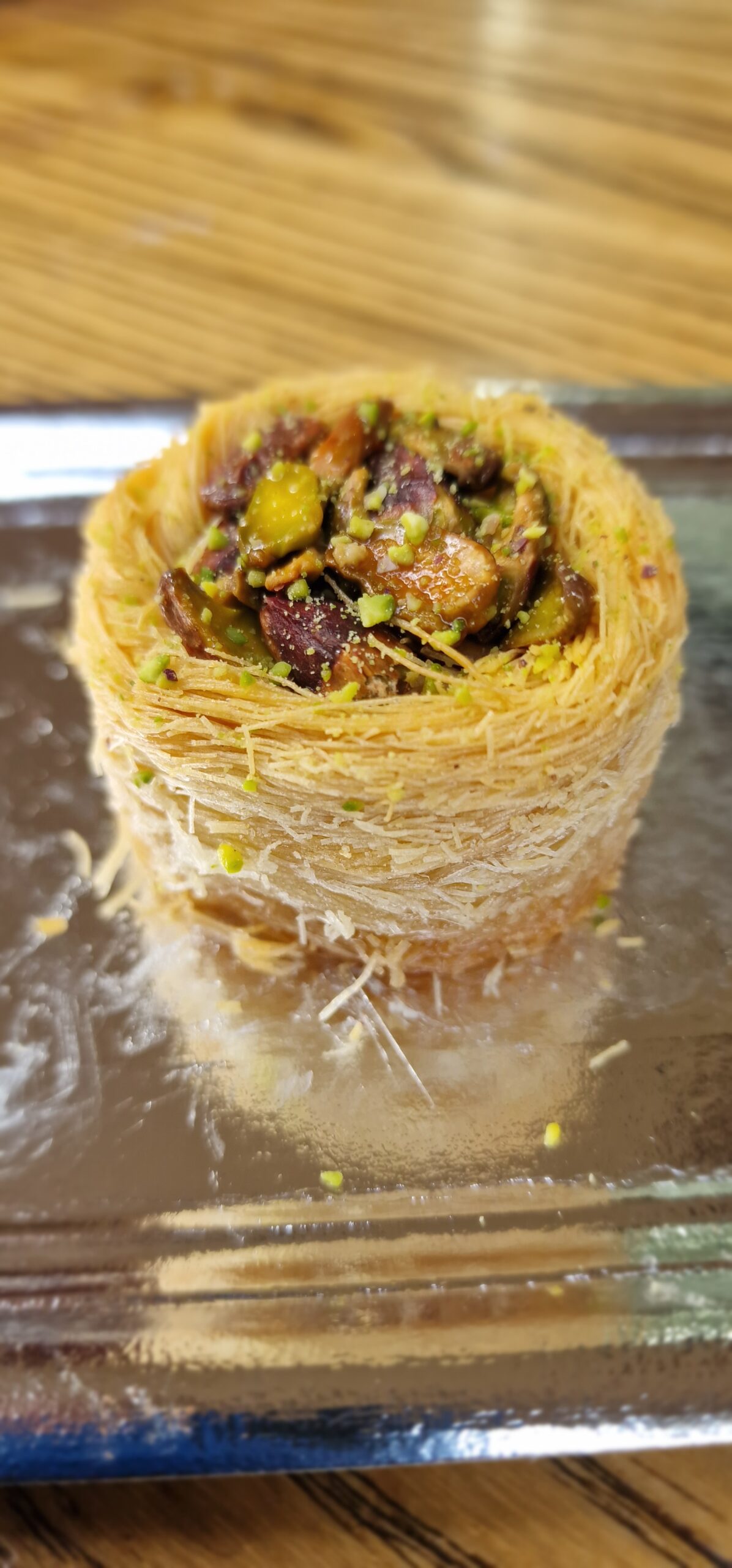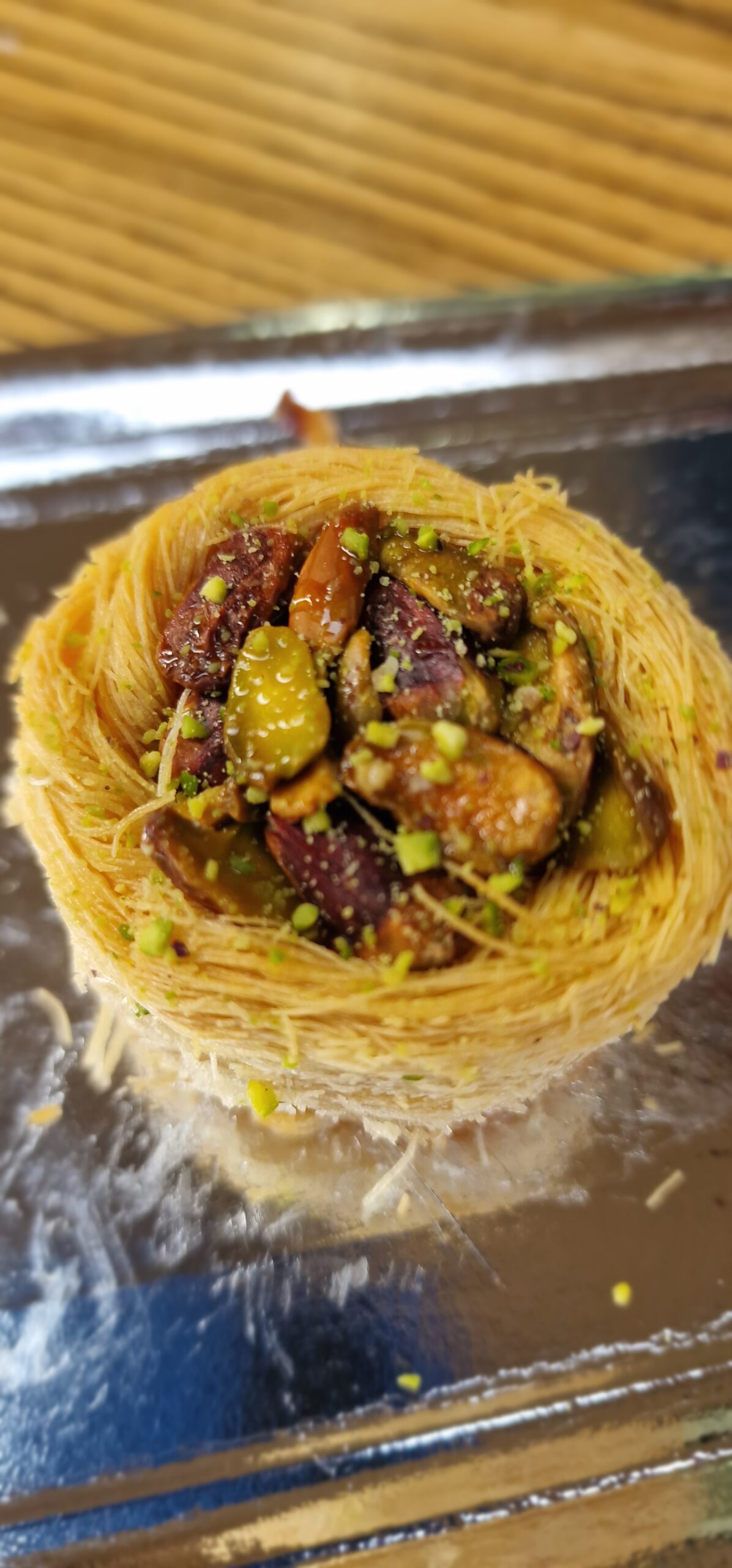 Delicioso dulce elaborado en forma de nido crujiente, relleno de suave crema de pistacho y decorado con trozos de pistachos seleccionados. Una combinación perfecta de textura y sabor que conquista desde el primer bocado, ideal como postre, snack o acompañamiento de café y té.
